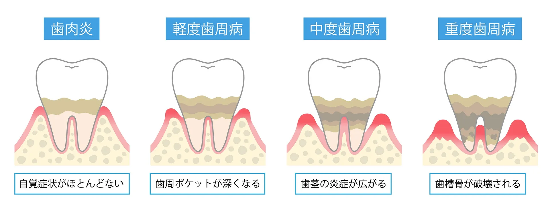 歯周病は細菌による感染症で、歯ぐきや骨に炎症を起こして進行していきます。